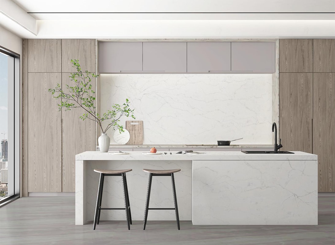 Aesthetic Versatility: The Carrara Marmi Quartz design features a bright white base, elegantly streaked with soft grey and subtle taupe veining. This timeless pattern complements virtually any design style, from classic and traditional to minimalist and contemporary. It brightens spaces, creates a sense of openness, and serves as a beautiful, neutral canvas for your cabinetry, flooring, and fixtures. Exceptional Durability & Strength: Quartz is one of the hardest minerals on earth. Our quartz slabs are engineered to be highly resistant to scratches, chips, and cracks. This makes them an exceptionally long-lasting material for high-traffic areas like kitchen countertops, where pots, pans, and knives are used daily. Non-Porous & Hygienic Surface: Unlike natural stone such as marble or granite, our artificial quartz stone is non-porous. This crucial characteristic means it will not absorb liquids, preventing stains from coffee, wine, oil, and other common household spills. More importantly, it inhibits the growth of bacteria, mold, and mildew, making it a supremely hygienic choice for kitchen countertops, bathroom vanities, and dining tables. A simple wipe with a soft cloth and mild detergent is all that's needed for a thorough clean. Low Maintenance: Say goodbye to the periodic sealing required for natural stone. The robust surface of our Carrara Marmi Quartz requires no sealing or special chemical treatments. Its effortless maintenance saves you time and money in the long run, ensuring your surfaces remain beautiful for years with minimal effort. Heat & Stain Resistance: While we always recommend using trivets for very hot pots and pans, our quartz slabs offer good resistance to moderate heat. Combined with their superior stain resistance, this makes them a practical and beautiful surface for any application.