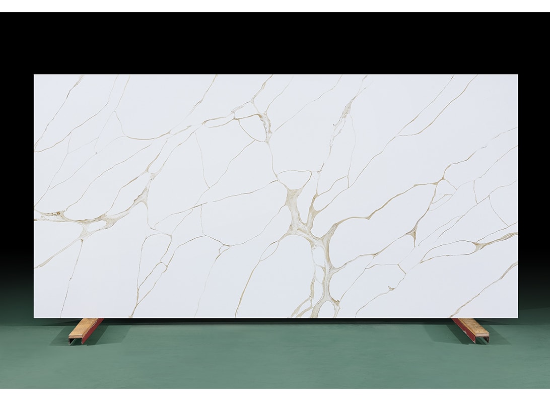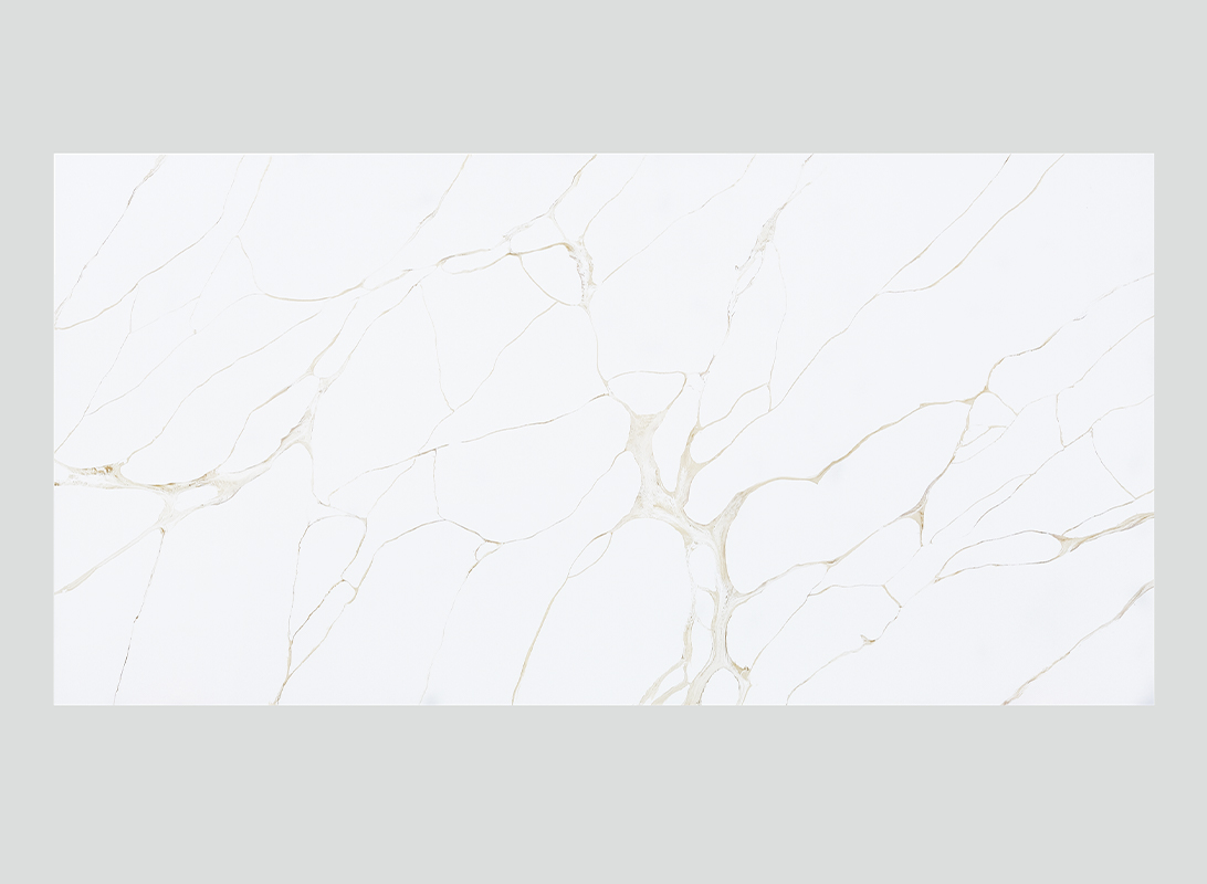 Carrara Moro Quartz Slab features intricate, golden-hued veins meandering in orderly chaos across a pristine white canvas, blending artistry and refinement.
